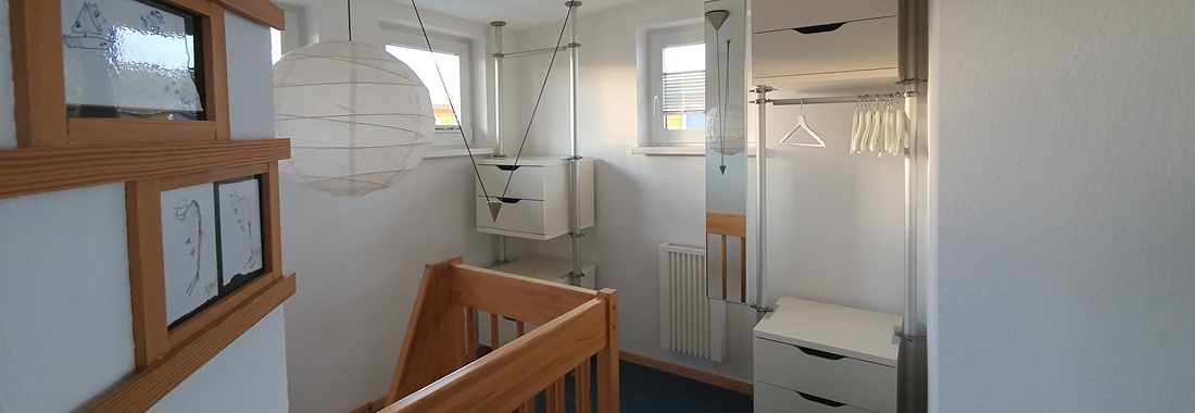 Im oberen Deck finden Sie 2 Schlafzimmer mit Doppelbetten und ein Zimmer mit Infrarotsauna. Von den Zimmern in der oberen Etage können Sie direkt auf den Balkon gehen, hier finden Sie 2 Relax-Liegen und einen wunderbaren Blick über den Bodden.
